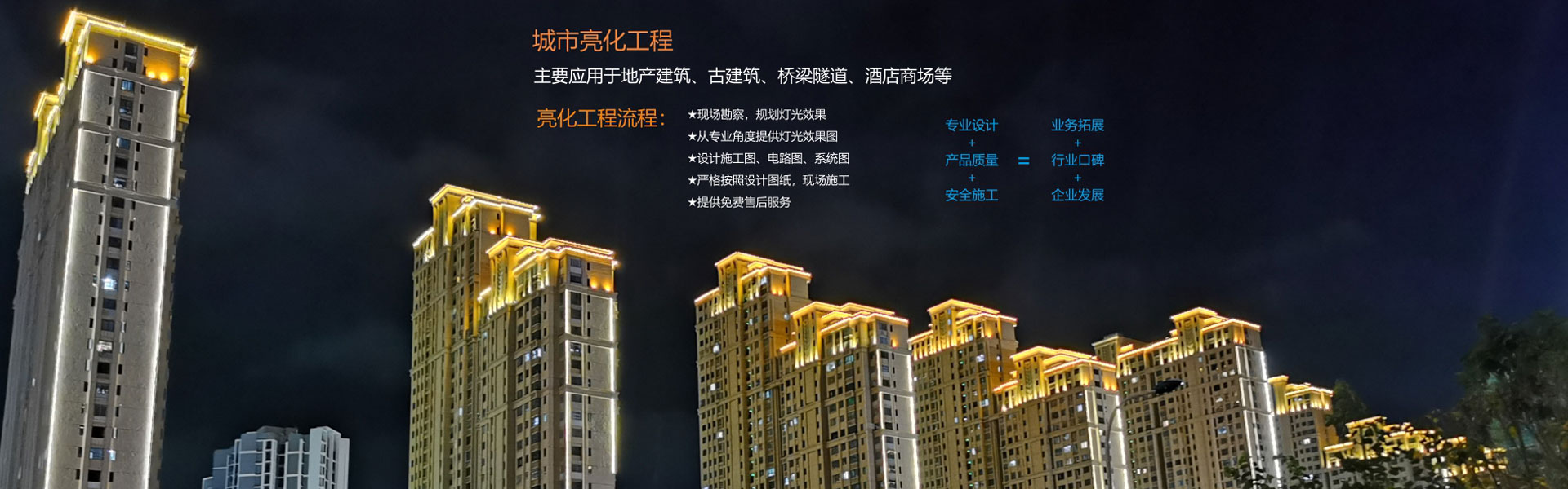 城市亮化工程,燈光工程以人為本,特別是作為住宅區(qū)的燈光工程,必須做到服務(wù)于人而不影響生活,使用安全、安裝美觀(guān)、融入環(huán)境、···